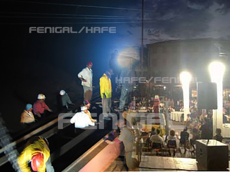 Система состоит из встроенного genet 1.2KVA, 2 воздуходувок, лампы металла 400W галоидной. Во первых потребитель должен переключить дальше genset и после этого воздуходувки для того чтобы надуть ткань на высоте в 4,5 метра от уровня земли. Дальше мы включаем лампа которая освещает область до 10 000 квадратных метров.